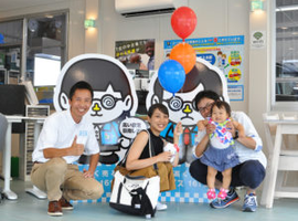 晴天のユーポス161堅田店です。 気が付けば5月も半ば・・今月もご来店ありがとうございます! 徐々に芝の緑も濃くなってきております♪ 今日は可愛いお客さまにきていただいたので、等身大キティが2代目デビュー☆ 今回は着地しております。。