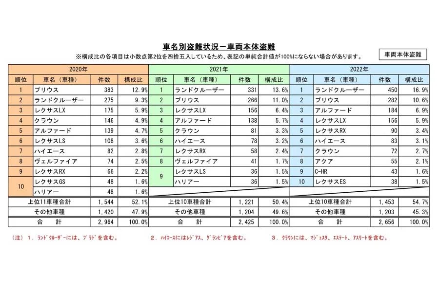 過去3年間の車名別盗難状況調査結果がこちらです