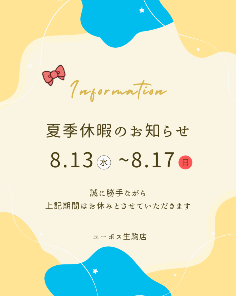 車(中古車)の買取・売却・査定ならユーポス HOME 店舗を探す 奈良県の店舗一覧 ユーポス生駒店 店舗ブログ 夏季休業のお知らせ 夏季休業のお知らせ こんにちは☀ ユーポス生駒店です🚙 本日は夏季休業のお知らせです 誠に勝手ながら 13日(水)~17日(日)の期間は夏季休業とさせていただきます。 ご不便・ご迷惑をお掛け致しますが宜しくお願い致します。 18日(月)から通常営業です 皆さまのご来店をお待ちしております お電話でのお問い合わせも大歓迎です📞 *** 🚘ユーポス生駒店🚘 生駒市新生駒台5-62 営業時間 10:00~19:00 フリーダイヤル 0120-06-1236 定休日 水曜日 全国対応!ユーポス無料相談受付 メーカー メーカーを選択 車種 車種を選択 年式 年式を選択 お名前(カナ) 電話番号 郵便番号 - 都道府県