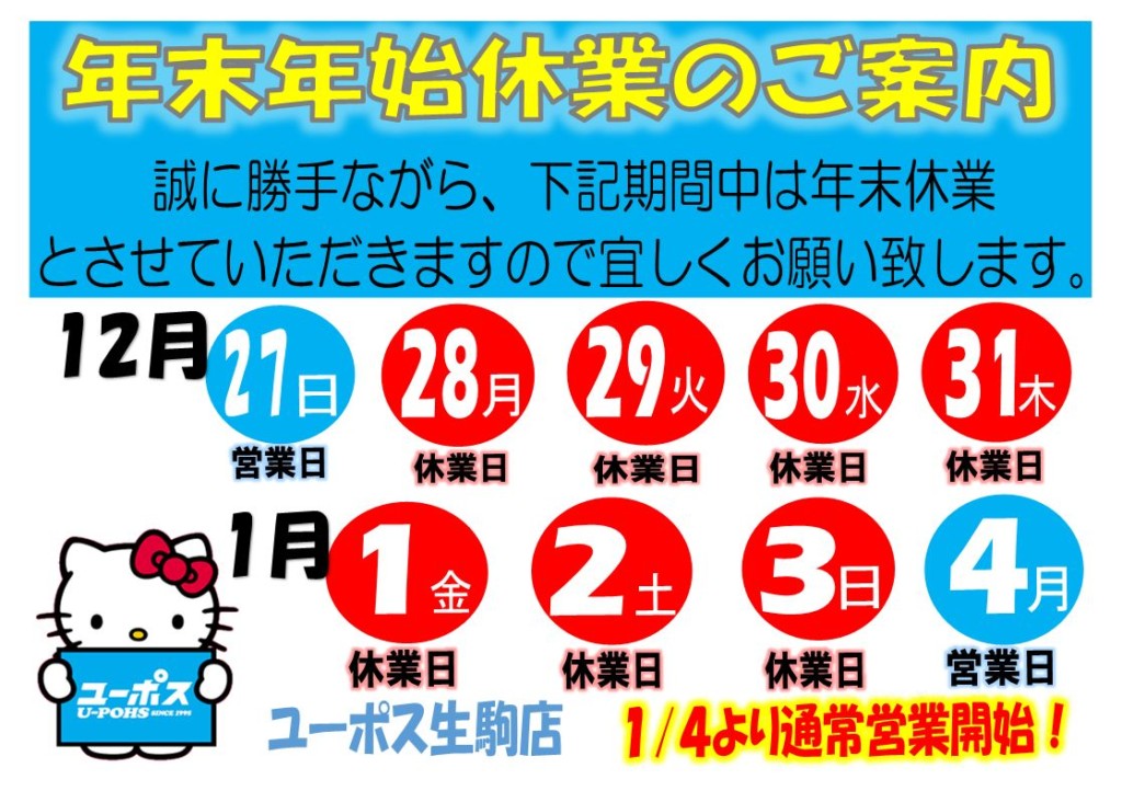 車(中古車)の買取・売却・査定ならユーポス HOME 店舗を探す 奈良県の店舗一覧 ユーポス生駒店 店舗ブログ 年末年始休業のお知らせ 年末年始休業のお知らせ こんにちは☀ ユーポス生駒店です🚙 朝晩の冷え込みが一層強くなり 師走の慌ただしさも肌で感じるようになってきましたね❅ 本日は営業日についてのお知らせです 12/28(月)から1/3(日)までの7日間は年末年始休業とさせていただきます🚘 12月の最終営業日は27日(月)となっております 年が明けると車の年式が一年古くなってしまいます 年式が落ちると査定に影響が出てしまうことも 是非ご売却を検討中の方は27日までにご来店ください 全国対応!ユーポス無料相談受付 メーカー メーカーを選択 車種 車種を選択 年式 年式を選択 お名前(カナ) 電話番号 郵便番号 - 都道府県