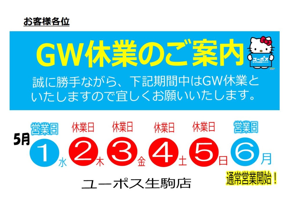 車(中古車)の買取・売却・査定ならユーポス HOME 店舗を探す 奈良県の店舗一覧 ユーポス生駒店 店舗ブログ GW休業のお知らせ GW休業のお知らせ こんにちは☀ ユーポス生駒店です🚙 本日はGW休業のお知らせです 誠に勝手ながら 下記期間中はGW休業とさせていただきます。 5/2(木)~5/5(日) 5月6日(月)から通常営業いたします! 4/29(月)・5/1(水)は営業しておりますので ぜひお休み前にご来店ください *** 🚘ユーポス生駒店🚘 生駒市新生駒台5-62 営業時間 10:00~19:00 フリーダイヤル 0120-06-1236 定休日 水曜日 全国対応!ユーポス無料相談受付 メーカー メーカーを選択 車種 車種を選択 年式 年式を選択 お名前(カナ) 電話番号 郵便番号 - 都道府県