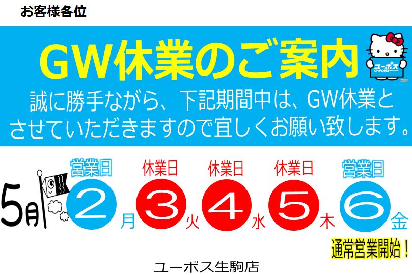 車(中古車)の買取・売却・査定ならユーポス HOME 店舗を探す 奈良県の店舗一覧 ユーポス生駒店 店舗ブログ GW休業日のお知らせ GW休業日のお知らせ こんにちは☀ ユーポス生駒店です🚙 本日はGW休業日のお知らせです 5月3日、4日、5日は休業日とさせていただきます。 4月29日は通常営業となります お車のお手放しを検討中の方は 是非GW休業前にユーポス生駒店へご来店ください お電話でのお問い合わせもお待ちしております📞 全国対応!ユーポス無料相談受付 メーカー メーカーを選択 車種 車種を選択 年式 年式を選択 お名前(カナ) 電話番号 郵便番号 - 都道府県