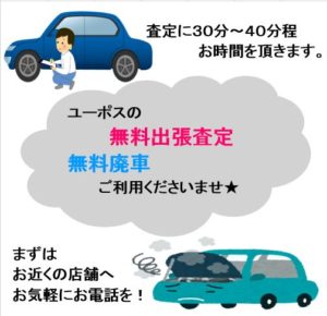 こんにちは☀ ユーポス生駒店です🚙 車の値段が知りたいけど忙しくてお店に行く時間がない。。。 そんなときは お近くのユーポスまでお電話を お客様のご自宅まで出張査定に行かせて頂きます 出張査定って、出張費用がかかるのでは、、、? と、ご心配のみなさん ユーポスの出張査定は無料でご利用いただけます