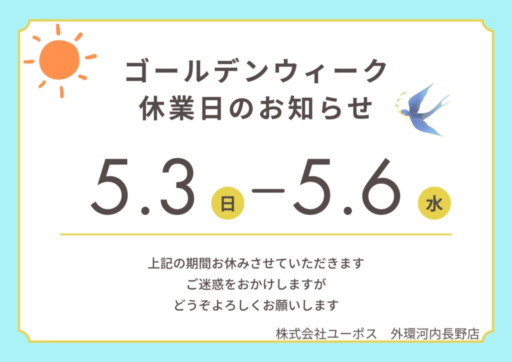 車(中古車)の買取・売却・査定ならユーポス HOME 店舗を探す 大阪府の店舗一覧 ユーポス外環河内長野店 店舗ブログ 【ゴールデンウィーク休業のお知らせ】 【ゴールデンウィーク休業のお知らせ】 こんにちは!ユーポス外環河内長野店です! 誠に勝手ではございますが5月3日(日)から5月6日(水)までゴールデンウィーク休業とさせていただきます。 お車の査定、買取を含むすべての業務を停止いたします。 5月7日(木)から通常営業となります。 ご不便をおかけしますが、ご理解いただけますと幸いです。 全国対応!ユーポス無料相談受付 メーカー メーカーを選択 車種 車種を選択 年式 年式を選択 お名前(カナ) 電話番号 郵便番号 - 都道府県