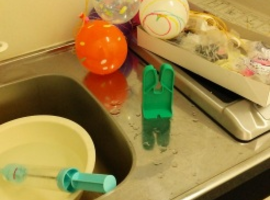 しぼんでしまった分を補給・・・ ヨーヨー作りです ・ ・ 水(空気)を入れて、ゴムを巻いて、留め具でとめて,完成 ・ という流なのですが、私は笑えるぐらいに作るのがへたくそなので、 ・ 大体どこかで1回か2回は失敗します ・ うまくふくらまない、ゴムを巻いている間に空気と水がぬける、留め具がうまくとまらない・・・ ・ たった