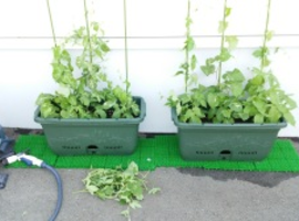 あまりに伸び放題だったのでちょっとだけ切りました ・ 右側の方はまだ綺麗に伸びてくれているんですが、左側の方の鉢はすごいのなんの・・・ ・ 支柱じゃなくてネットにしたらもっと絡まるところがあっていい感じになっていたのかもしれません