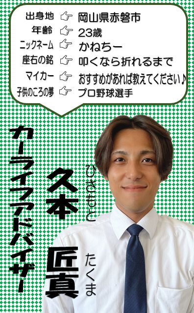 こんにちは ユーポス外環八尾店です 今日は、度々お客様からイケメンと称賛されるスタッフを ご紹介させて頂きます その名も、久本匠真 岡山出身なので、方言が特徴的でおちゃめな一面がある久本です 入社してまだ半年ですが、お客様のお役に立てるよう日々精進しています 土日は、店外で旗振りをしています お気軽にお声がけください