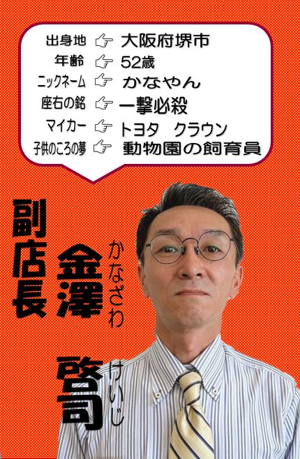 こんにちは ユーポス外環八尾店です 今日から本格的に寒くなってきましたね 体調が崩れやすくなりますのでご自愛くださいね さて、ユーポス外環八尾店のリピート様№1のスタッフ紹介をしたいと思います 八尾店配属年数10年という、八尾を知り尽くしたスタッフです その名も、副店長 金澤啓司 きっと八尾市の方はご存知の方が多いのではないでしょうか
