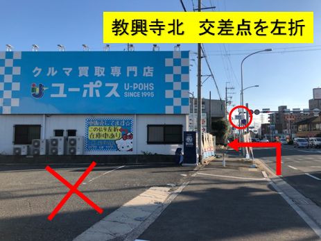 こんにちは ユーポス外環八尾店です 大阪市内方面から、いらっしゃるお客様に駐車場のご案内です ご不明な方はお気軽にご連絡頂ければ幸いです こちらは当店の敷地ではございません 教興寺北の交差点を、左折 お願いします 左折して頂くと、左側に看板が出て参ります ユーポスin看板の所が駐車場になります