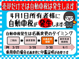こんにちは ユーポス外環八尾店です 3月も残り半月となりました 以前ご案内致しました、自動車税ですが 3月中に名義変更しなければ自動車税が発生します 皆様5月ではありません 4月1日現在の名義の方に納税義務が発生します なので、3月中には名義変更が必要と言う事です 当店では3月28日が最終受付です 譲渡書類も必要になりますので平日26日