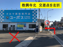 こんにちは ユーポス外環八尾店です 大阪市内方面から、いらっしゃるお客様に駐車場のご案内です こちらは当店の敷地ではございません 教興寺北の交差点を、左折 お願いします 左折して頂くと、左側に看板が出て参ります ユーポスin看板の所が駐車場になります 迷われた際や、ご不明な点がございましたら お