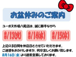 こんにちわ!ユーポス外環八尾店です 8月のお盆の休店日をご案内いたします 8月13日(火)、8月14日(水)、8月15日(木) は誠に勝手ながら休店日とさせていただきます 休店日は電話が繋がりません 買取のご相談・在庫車のお問い合わせは お早めにどうぞ ユーポス外環八尾店 FREE:0120-68-12