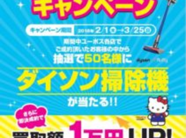 皆さん、こんにちは ユーポス外環八尾店の福田です 今日はまだ暖かいほうですね もう始まってるのですがユーポスでは 2/1~3/25までキャンペーンやってます なんとご成約頂いた方から抽選で50名様にダイソン掃除機が当たります 私もほしい掃除機です この機会に是非ユーポスまで